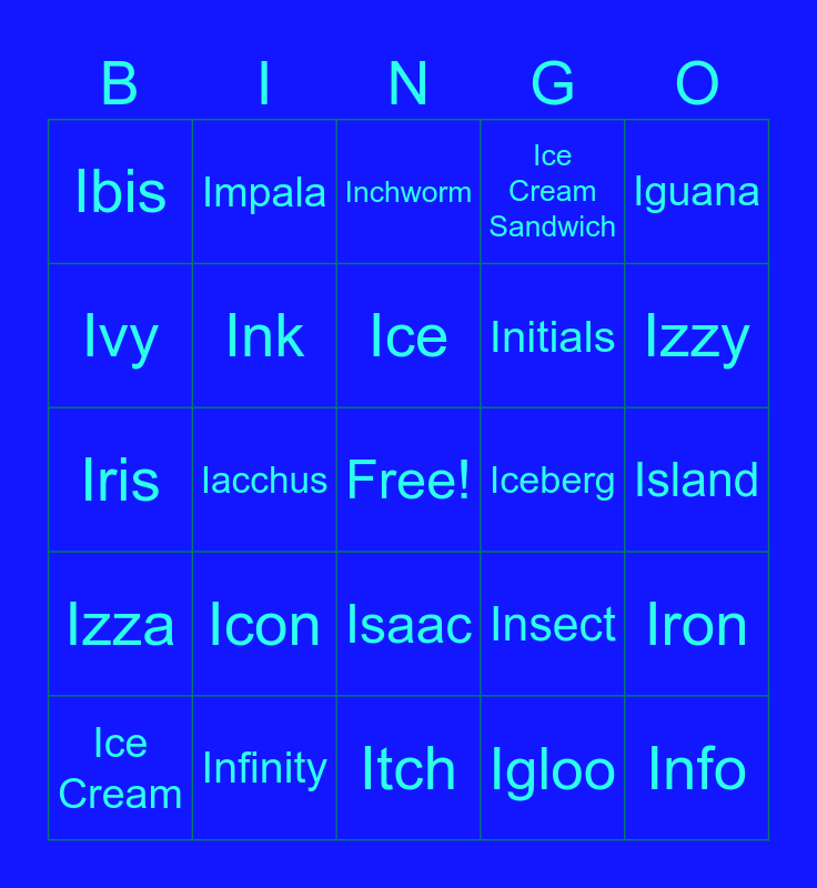 This bingo card has a free space and 24 words: Ice Cream, Icon, Ice, Igloo, Iguana, Ibis, Impala, Inchworm, Iceberg, Island, Iris, Ink, Insect, Iron, Ivy, Infinity, Itch, Ice Cream Sandwich, Izzy, Izza, Iacchus, Isaac, Initials and Info.