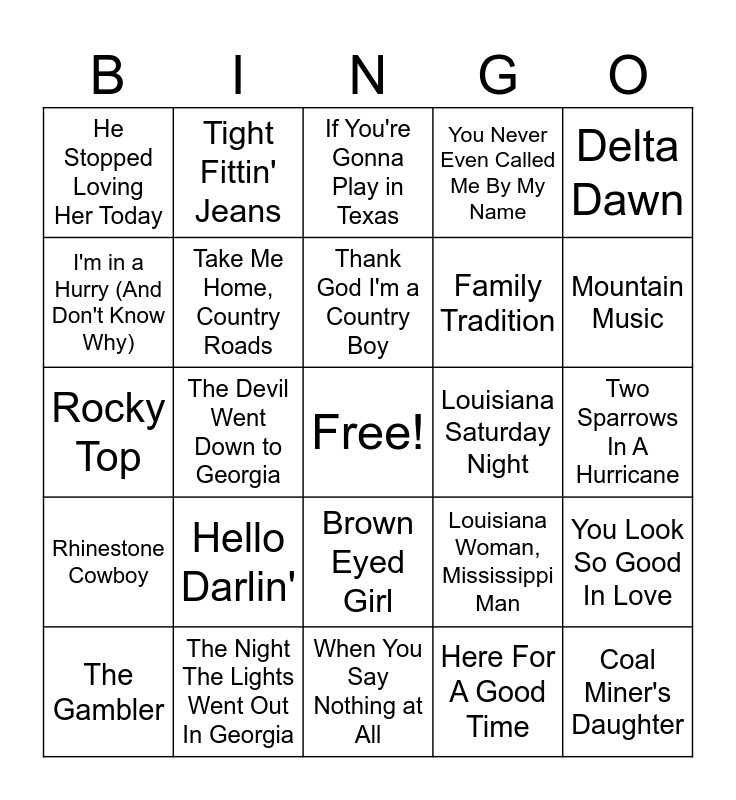 This bingo card has a free space and 39 words: Jolene, 9 to 5, I Will Always Love You, Take Me Home, Country Roads, The Gambler, Brown Eyed Girl, Thank God I'm a Country Boy, Kiss an Angel Good Mornin', Delta Dawn, Rhinestone Cowboy, The Devil Went Down to Georgia, You Never Even Called Me By My Name, Coal Miner's Daughter, Two Sparrows In A Hurricane, Louisiana Saturday Night, Hello Darlin', I Walk the Line, He Stopped Loving Her Today, Forever and Ever, Amen, Louisiana Woman, Mississippi Man, I'm in a Hurry (And Don't Know Why), When You Say Nothing at All, Family Tradition, Mountain Music, Deeper Than the Holler, I'd Just Love To Lay You Down, Slow Hand, Dixieland Delight, Don't Close Your Eyes, Tight Fittin' Jeans, Grandpa (Tell Me 'Bout The Good Old Days), A Country Boy Can Survive, If You're Gonna Play in Texas, The Night The Lights Went Out In Georgia, Here For A Good Time, Troubadour, You Look So Good In Love, Rocky Top and Lesson In Leavin'.