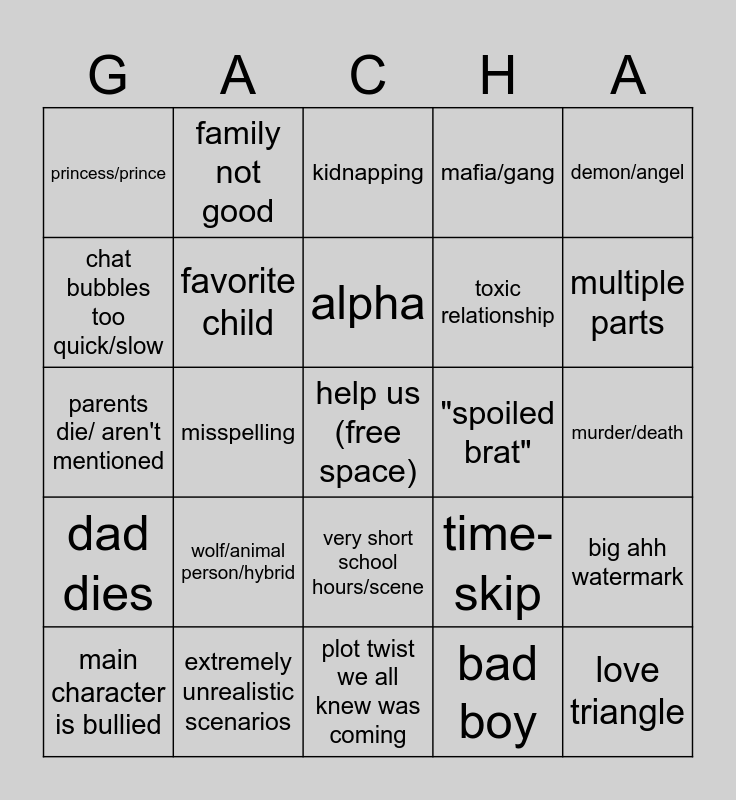 This bingo card has a free space and 24 words: main character is bullied, wolf/animal person/hybrid, alpha, bad boy, demon/angel, princess/prince, family not good, kidnapping, "spoiled brat", murder/death, parents die/ aren't mentioned, favorite child, time-skip, big ahh watermark, chat bubbles too quick/slow, extremely unrealistic scenarios, plot twist we all knew was coming, mafia/gang, multiple parts, dad dies, misspelling, very short school hours/scene, toxic relationship and love triangle.