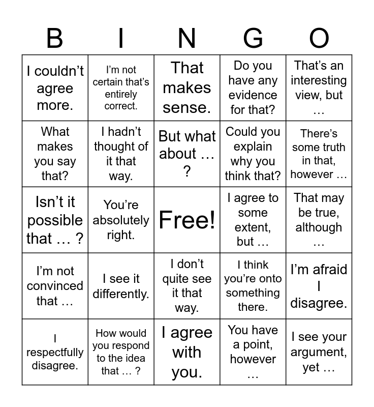 This bingo card has a free space and 31 words: I agree with you., That’s a good point., You’re absolutely right., I see what you mean., I couldn’t agree more., That makes sense., I hadn’t thought of it that way., I think you’re onto something there., I agree to some extent, but …, You have a point, however …, That may be true, although …, I see your argument, yet …, I understand what you’re saying, but …, While I agree in principle, …, There’s some truth in that, however …, I’m not sure I agree., I’m afraid I disagree., I see it differently., I’m not convinced that …, I don’t quite see it that way., That’s an interesting view, but …, I take a different position., I respectfully disagree., I’m not certain that’s entirely correct., Could you explain why you think that?, What makes you say that?, Do you have any evidence for that?, Isn’t it possible that … ?, How would you respond to the idea that … ?, But what about … ? and Have you considered … ?.