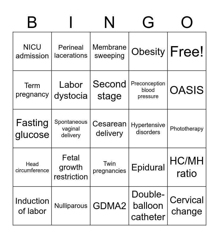 This bingo card has 44 words: Labor dystocia, Cesarean delivery, Vaginal delivery, Induction of labor, Cervical ripening, Double-balloon catheter, Membrane sweeping, Bishop score, Free!, Nulliparous, Obesity, Hypertensive disorders, Twin pregnancies, Fetal growth restriction, Gestational diabetes, GDMA2, OGTT, Fasting glucose, Macrosomia, OASIS, Perineal lacerations, Antenatal corticosteroids, Late preterm, NICU admission, Hypoglycemia, Phototherapy, Respiratory support, Oxytocin, Epidural, Head circumference, Maternal height, HC/MH ratio, Glucose intolerance, Shoulder dystocia, Spontaneous vaginal delivery, Vacuum-assisted delivery, Forceps delivery, Cervical change, Second stage, Term pregnancy, Preconception blood pressure, Labor dystocia, Labor dystocia and Labor dystocia.