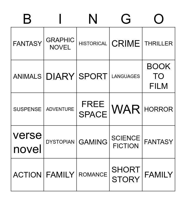 This bingo card has a free space and 29 words: ACTION, CRIME, ADVENTURE, COMEDY, FANTASY, HISTORICAL, DIARY, DYSTOPIAN, WAR, FAMILY, HORROR, FAMILY, ROMANCE, SHORT STORY, BOOK TO FILM, SUPERNATURAL, GAMING, verse novel, THRILLER, SUSPENSE, SCIENCE FICTION, BOOK TO FILM, LANGUAGES, ANIMALS, CRIME, GRAPHIC NOVEL, FANTASY, SPORT and FICTION.