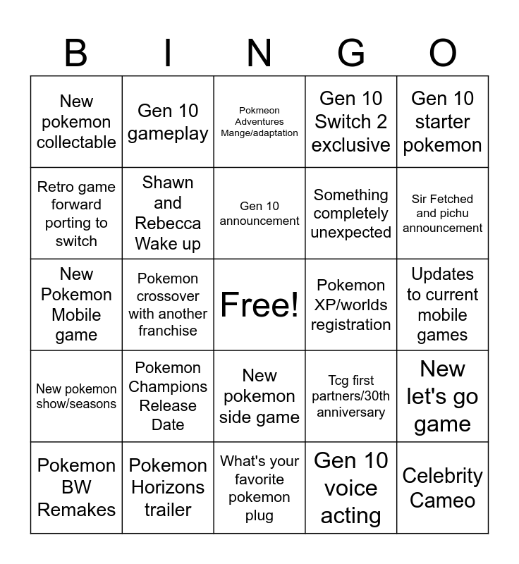 This bingo card has a free space and 24 words: Pokemon Champions Release Date, Pokemon Horizons trailer, Gen 10 announcement, Pokemon BW Remakes, Gen 10 starter pokemon, New pokemon collectable, Retro game forward porting to switch, Gen 10 gameplay, Pokemon XP/worlds registration, New pokemon side game, Something completely unexpected, New Pokemon Mobile game, Tcg first partners/30th anniversary, New let's go game, Shawn and Rebecca Wake up, Gen 10 voice acting, Updates to current mobile games, Pokmeon Adventures Mange/adaptation, Sir Fetched and pichu announcement, Pokemon crossover with another franchise, Celebrity Cameo, New pokemon show/seasons, Gen 10 Switch 2 exclusive and What's your favorite pokemon plug.
