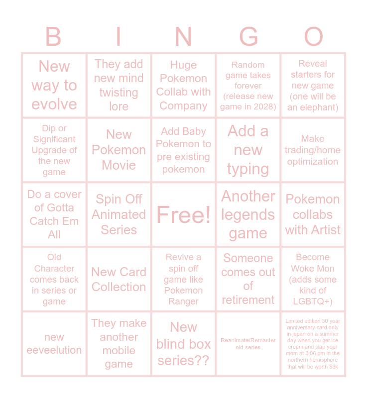 This bingo card has a free space and 29 words: new eeveelution, india based pokemon game, Spin Off Animated Series, New Gimmick Explained, New way to evolve, Huge Pokemon Collab with Company, New Pokemon Movie, New Card Collection, Another legends game, They make another mobile game, Pokemon collabs with Artist, Limited edition 30 year anniversary card only in japan on a summer day when you get ice cream and slap your mom at 3:06 pm in the northern hemisphere that will be worth $3k, New blind box series??, Reanimate/Remaster old series, Make trading/home optimization, Pokemon Horror Game, Revive a spin off game like Pokemon Ranger, Old Character comes back in series or game, Reveal starters for new game (one will be an elephant), Do a cover of Gotta Catch Em All, Someone comes out of retirement, Tease the box legends?, Add a new typing, Dip or Significant Upgrade of the new game, Random game takes forever (release new game in 2028), They add new mind twisting lore, Become Woke Mon (adds some kind of LGBTQ+), Add Baby Pokemon to pre existing pokemon and Incorporate more Pokemon Customization/costumes.