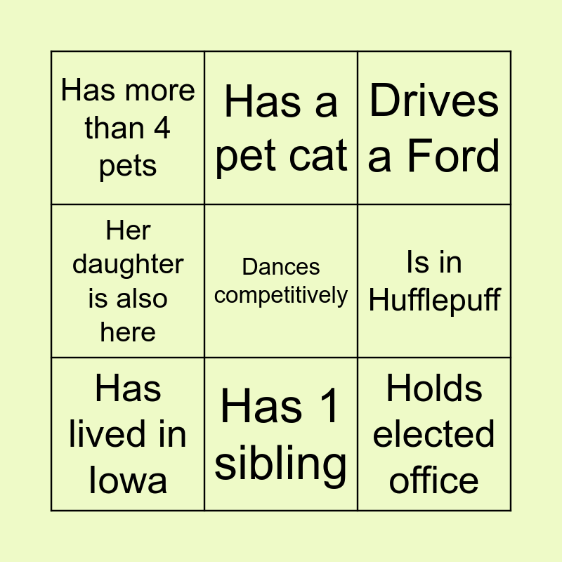 This bingo card has 129 words: Free!, Has a pet cat, Has a pet dog, Has long hair, Has short hair, Is wearing something with flowers, Is wearing a necklace, Is wearing pants, Is wearing a dress, Is wearing a bracelet, Has black hair, Has brown hair, Has blond hair, Has curly hair, Has white hair, Has straight hair, Is less than 10 years old, Is more than 70 years old, Knows what movie the song “Golden” is from, Was born in China, Has lived in England, Plays board games, Likes herbal tea, Is a teacher, Has 1 kid, Has 2 kids, Has 3 kids, Has 4 kids, Is between the ages of 10 and 20, Has made home movies, Has no siblings, Has 1 sibling, Has 2 siblings, Has 3 siblings, Has been to Young Life camp, Makes a funny face if you say “67”, Favorite Mario Character is Peach, Loves dogs, Loves cats, Is an artist, Loves puns, Loves water color painting, Likes Kirby, Likes U2, Is a doctor, Is a nurse, Has lived in Germany, Owns a truck, Drives a Tesla, Grew up in Spokane, Teaches swim lessons, Has been to Japan, Drove 10-20 minutes to get here, Drove 20-30 minutes to get here, Drove 30 minutes - 1 hour to get here, Drove 1-2 hours to get here, Drove 2-6 hours to get here, Flew to get here, Was born in another state besides Washington, Went to Catholic school, Watched the Superbowl, Plays the crossword, Plays Wordle, Drinks Topo Chico, Drives a Toyota, Drives a Ford, Drives a Subaru, Has 4 daughters, Her mom is also here, Her daughter is also here, Likes bike riding, Works at Microsoft, Likes to knit, Likes to crochet, Owns chickens, Works for a church, Has lived in Utah, Has lived in California, Has cousins that live in Oregon, Prefers “The Lord of the Rings” to “The Hobbit”, Can play “Baby Shark” on the piano, Has more than 4 pets, Works/has worked in schools as something other than a teacher, Favorite Mario Character is Rosalina, Has lived in Iowa, Has an owl living at her house, Homeschools, Homeschooled, Likes coffee, Mariners fan, Seahawks fan, Works in web design, Is drawing a web comic, Plays guitar, Plays piano, Is wearing glasses, Works in the wedding industry, Dances competitively, Holds elected office, Is a twin, Is in Gryffindor, Is in Hufflepuff, Is in Slytherin, Is in Ravenclaw, Has been to Mexico, Has been to Canada, Can do a cartwheel, Thinks you are funny, Gives you a hug, Says, “It’s been so long!”, Says, “It’s nice to see you!”, Spills a drink, Says, “How are you?”, Says, “How do you know Joey?”, Asks about traffic, Greets you by name, Asks you if you know where the bathroom is, Says hi to you in the bathroom, Complements the food, Watches “The Loud House”, Likes Bluey, Knows who Bluey’s brother is, Favorite Disney princess is Moana, Knows what movie Timothee Chalamet gets hit on the head with a frying pan, Will send you to Azkaban, Pulls her hood/shirt over her head, Knows which “Spy Kids” movie Elijah Wood is in, Knows where the statue of Dietrich Bonhoeffer is in London and Favorite song last summer was “The Electric Slide”.