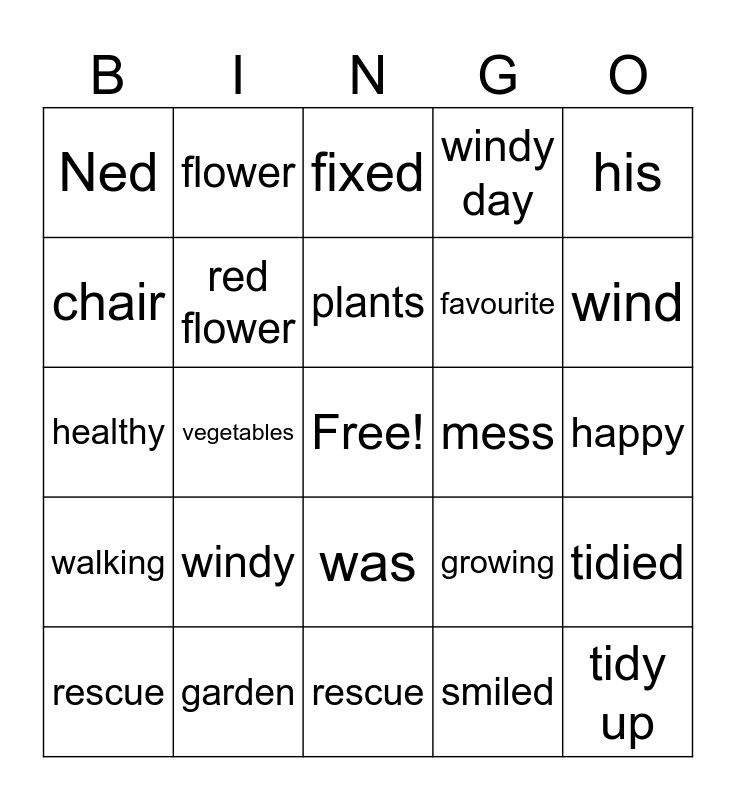 This bingo card has a free space and 24 words: windy, garden, plants, rescue, his, Ned, chair, flower, mess, was, favourite, healthy, growing, tidied, red flower, smiled, happy, fixed, wind, vegetables, tidy up, walking, windy day and rescue.