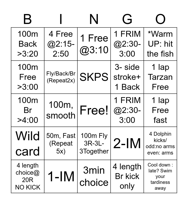 This bingo card has a free space and 24 words: 4 length choice@ 20R NO KICK, 50m, Fast (Repeat 5x), SKPS, 4 length Br kick only, *Warm UP: hit the fish, 100m Back >3:20, 4 Free @2:15-2:50, 1 Free @3:10, 1 FRIM @2:30-3:00, 1 lap Free fast, 100m Br >4:00, Fly/Back/Br (Repeat2x), 2-IM, 4 Dolphin kicks/ odd:no arms even: arms, 100m Free >3:00, 1-IM, 3min choice, 1 FRIM @2:30-3:00, 1 lap Tarzan Free, Wild card, 100m, smooth, 100m Fly 3R-3L-3Together, 3- side stroke+ 1 Back and Cool down : late? Swim your tardiness away.