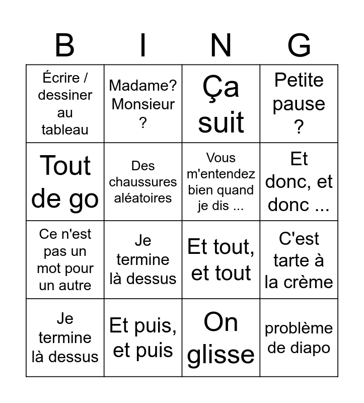 This bingo card has 16 words: Et puis, et puis, C'est tarte à la crème, Ça suit, Écrire / dessiner au tableau, Ce n'est pas un mot pour un autre, Madame? Monsieur ?, Et tout, et tout, On glisse, Tout de go, Des chaussures aléatoires, Je termine là dessus, Petite pause ?, Je termine là dessus, Et donc, et donc ..., Vous m'entendez bien quand je dis ... and problème de diapo.