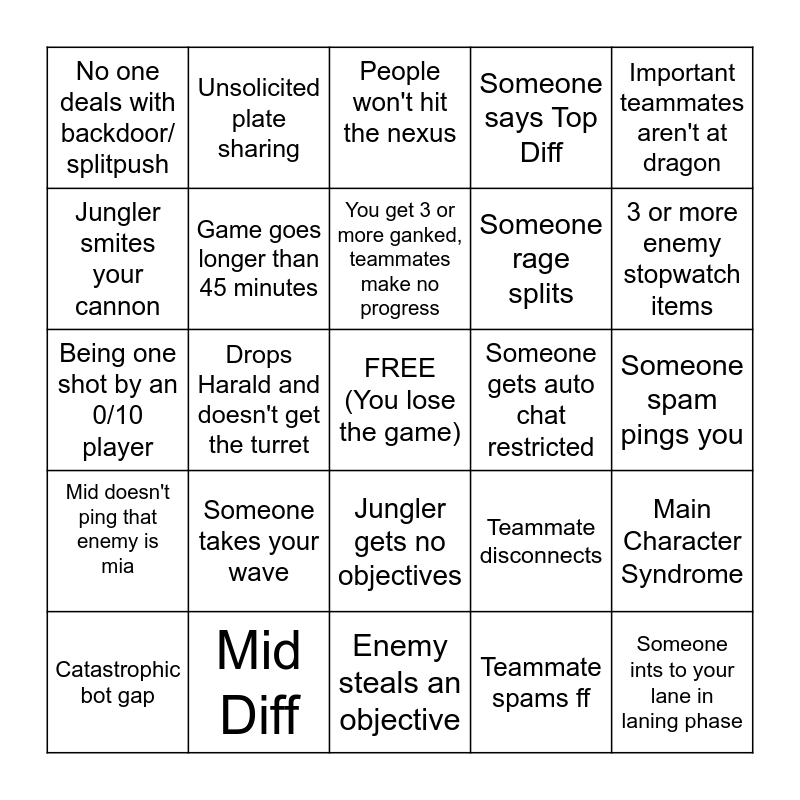 This bingo card has a free space and 24 words: Someone takes your wave, Mid Diff, You get 3 or more ganked, teammates make no progress, Catastrophic bot gap, Important teammates aren't at dragon, No one deals with backdoor/ splitpush, Jungler smites your cannon, Unsolicited plate sharing, Someone gets auto chat restricted, Jungler gets no objectives, Someone rage splits, Being one shot by an 0/10 player, Teammate disconnects, Main Character Syndrome, Game goes longer than 45 minutes, Teammate spams ff, Someone spam pings you, People won't hit the nexus, 3 or more enemy stopwatch items, Drops Harald and doesn't get the turret, Someone ints to your lane in laning phase, Mid doesn't ping that enemy is mia, Someone says Top Diff and Enemy steals an objective.