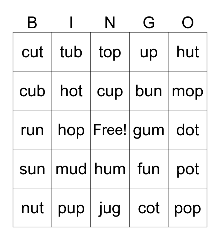 This bingo card has a free space and 24 words: mud, pup, cup, nut, hut, cut, cub, tub, gum, hum, bun, run, fun, pot, hot, cot, dot, top, mop, hop, pop, sun, up and jug.