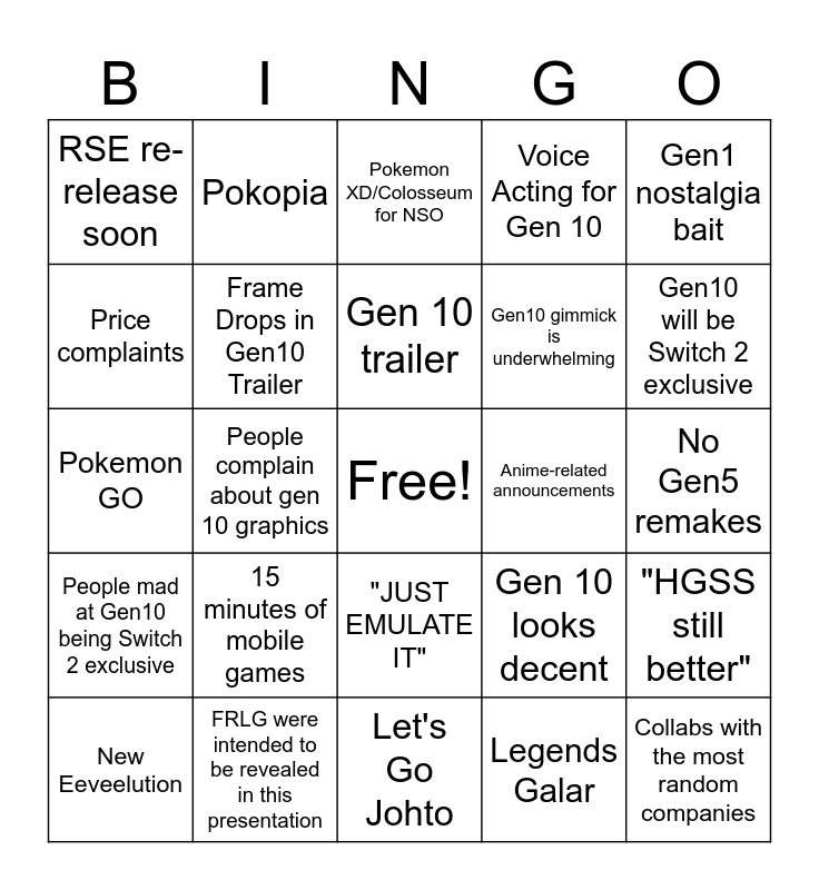 This bingo card has a free space and 24 words: 15 minutes of mobile games, FRLG were intended to be revealed in this presentation, Gen 10 trailer, New Eeveelution, Gen1 nostalgia bait, RSE re-release soon, Price complaints, Pokopia, Anime-related announcements, "JUST EMULATE IT", Gen10 gimmick is underwhelming, Pokemon GO, Gen 10 looks decent, "HGSS still better", Frame Drops in Gen10 Trailer, Legends Galar, No Gen5 remakes, Pokemon XD/Colosseum for NSO, Gen10 will be Switch 2 exclusive, People complain about gen 10 graphics, Collabs with the most random companies, People mad at Gen10 being Switch 2 exclusive, Voice Acting for Gen 10 and Let's Go Johto.