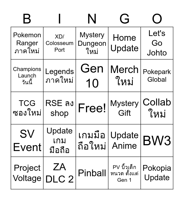This bingo card has a free space and 24 words: Update เกม มือถือ, ZA DLC 2, Gen 10, Project Voltage, Let's Go Johto, Pokemon Ranger ภาคใหม่, Champions Launch วันนี้, XD/ Colosseum Port, Mystery Gift, เกมมือถือใหม่, Merch ใหม่, TCG ซองใหม่, Update Anime, BW3, Legends ภาคใหม่, PV บิ้วเด็กหนวด ตั้งแต่ Gen 1, Collab ใหม่, Mystery Dungeon ใหม่, Pokepark Global, RSE ลง shop, Pokopia Update, SV Event, Home Update and Pinball.