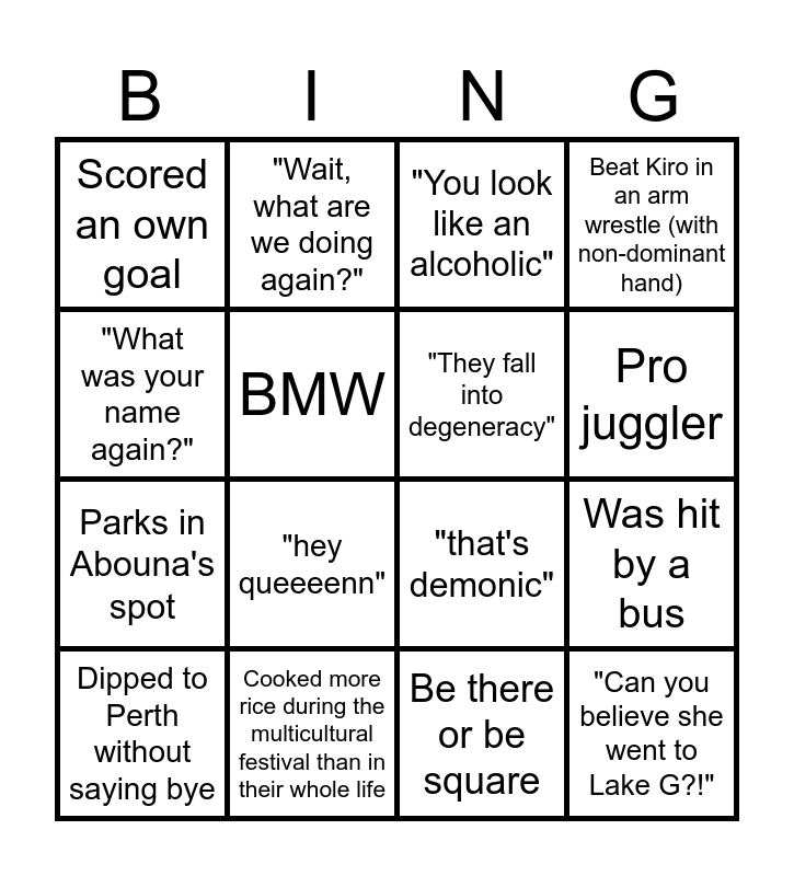 This bingo card has 16 words: Cooked more rice during the multicultural festival than in their whole life, Was hit by a bus, "You look like an alcoholic", Scored an own goal, Parks in Abouna's spot, "Wait, what are we doing again?", "that's demonic", Be there or be square, "What was your name again?", BMW, Dipped to Perth without saying bye, Beat Kiro in an arm wrestle (with non-dominant hand), "hey queeeenn", Pro juggler, "They fall into degeneracy" and "Can you believe she went to Lake G?!".