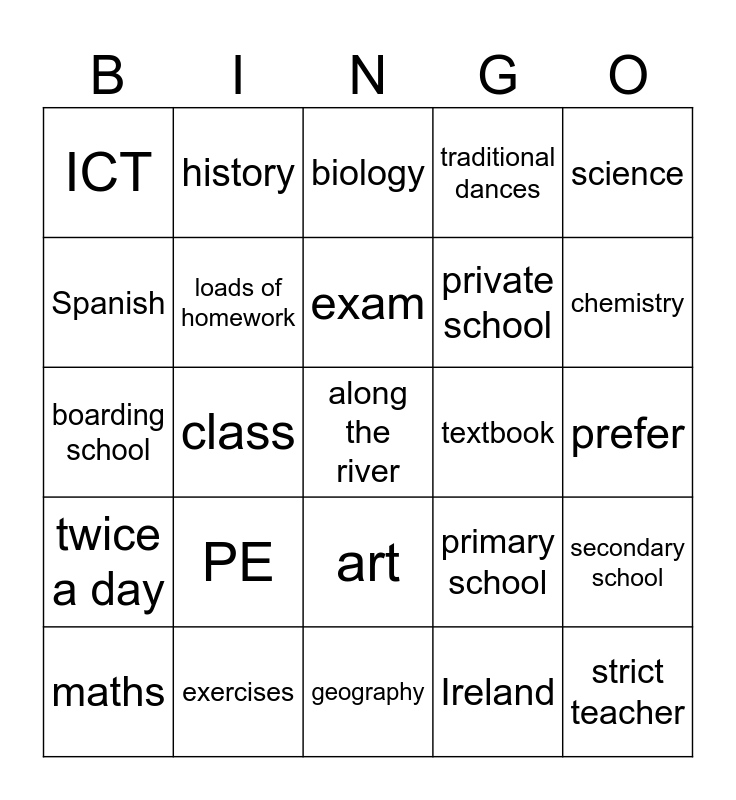 This bingo card has 25 words: PE, geography, exam, maths, science, ICT, Spanish, history, textbook, art, private school, boarding school, primary school, secondary school, loads of homework, strict teacher, prefer, biology, chemistry, class, along the river, exercises, twice a day, traditional dances and Ireland.