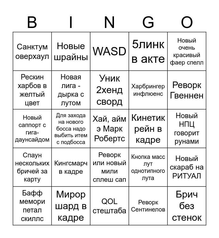 This bingo card has a free space and 24 words: Кингсмарч в кадре, Мирор шард в кадре, Уник 2хенд сворд, Бафф мемори петал скиллс, Новый очень красивый фаер спелл, Санктум оверхаул, Рескин харбов в желтый цвет, Новые шрайны, Кинетик рейн в кадре, Реворк или новый мили сплеш сап, Харбрингер инфлюенс, Новый саппорт с гига-даунсайдом, Кнопка масс лут однотипного лута, Новый скараб на РИТУАЛ, Новая лига - дырка с лутом, Реворк Сентинелов, Новый НПЦ говорит рунами, WASD, Реворк Гвеннен, Для захода на нового босса надо выбить итем с подбосса, Брич без стенок, Спаун нескольких бричей за карту, 5линк в акте and QOL стештаба.