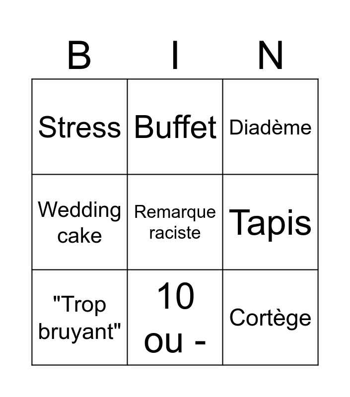 This bingo card has a free space and 8 words: Tapis, Diadème, Buffet, "Trop bruyant", Stress, Cortège, Wedding cake and 10 ou -.