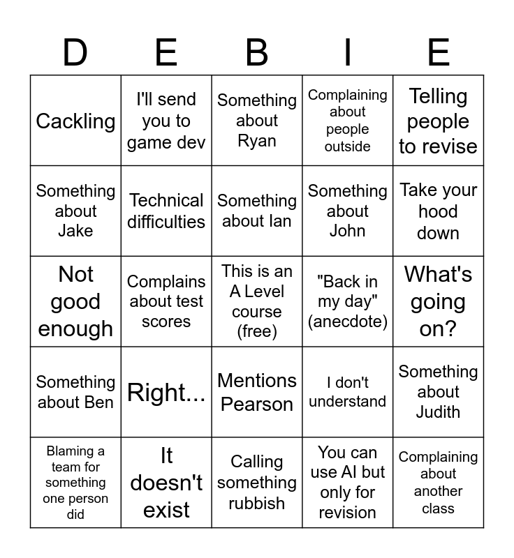 This bingo card has a free space and 24 words: Right..., It doesn't exist, Something about Ian, Blaming a team for something one person did, Telling people to revise, Cackling, Something about Jake, I'll send you to game dev, "Back in my day" (anecdote), Mentions Pearson, Something about John, Not good enough, I don't understand, Something about Judith, Technical difficulties, You can use AI but only for revision, What's going on?, Something about Ryan, Take your hood down, Complains about test scores, Complaining about another class, Something about Ben, Complaining about people outside and Calling something rubbish.
