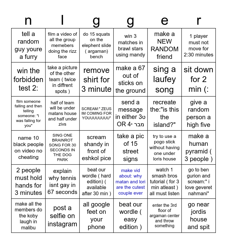 This bingo card has 36 words: make vid about: why matan and lori are the cutest couple ever, beat our wordle ( hard edition) ( available after 30 min ), beat our wordle ( easy edition ), win the forbidden test 2:, name 10 black people on video no cheating, send a message in either ט3 OR מבר י4, take a picture of the other team ( twice in diffrent spots ), all google feet on your phone, make a NEW RANDOM friend, watch 1 smash bros tutorial ( for 3 min atleast ) all must listen, sit down for 2 min (:, win 3 matches in brawl stars using mandy, go to ben gurion and scream:" i love geveret nahmani", half of team will be under matans house and half under zivs, make a 67 out of sticks on the ground, tell a random guy youre a furry, 2 people must hold hands for 3 minutes, recreate the:"is this the island?", film someone falling and then telling someone: "i was falling for you", do 15 squats on the elephent slide ( argaman) bench, SCREAM:" ZEUS IM COMING FOR YOUUUUUUUU", SING ONE BRAINROT SONG FOR 30 SECONDS IN THE DOG PARK, take a pic of 15 street signs, scream shandy in front of eshkol pice, try to use a pogo stick without having one under loris house, film a video of all the group memebers doing the rizz face, sing a laufey song, post a selfie on instagram, remove shirt for 3 minute, 1 player must not move for 2:30 minutes, go near jordis house and spit, make all the members do the koby laugh in malibu, make a human pyramid ( 3 people ), give a random person a high five, explain why tennis isnt gay in 67 seconds and enter the 3rd floor of argaman center and throw something.