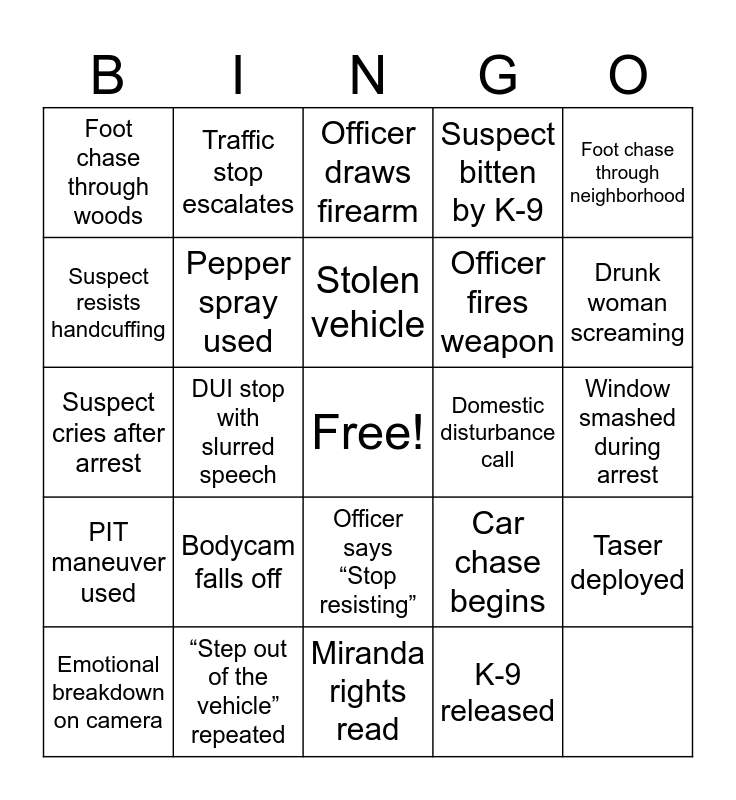 This bingo card has a free space and 24 words: PIT maneuver used, “Step out of the vehicle” repeated, Officer says “Stop resisting”, Car chase begins, Foot chase through neighborhood, Foot chase through woods, Traffic stop escalates, Officer draws firearm, Officer fires weapon, Taser deployed, Suspect resists handcuffing, Pepper spray used, Suspect pulls a knife, Domestic disturbance call, Drunk woman screaming, Emotional breakdown on camera, DUI stop with slurred speech, Stolen vehicle, Suspect bitten by K-9, Window smashed during arrest, Suspect cries after arrest, Bodycam falls off, Miranda rights read and K-9 released.