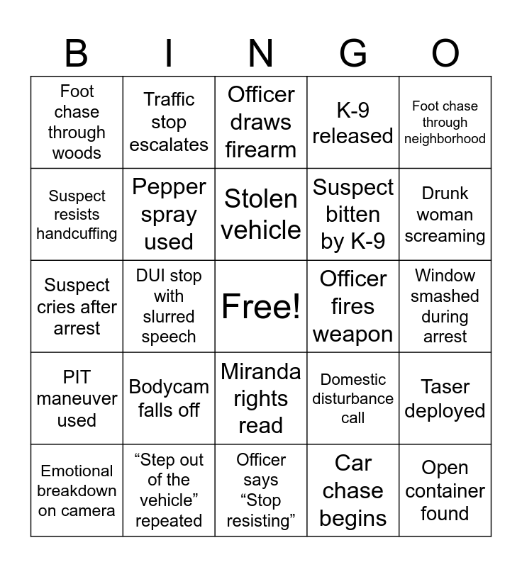 This bingo card has a free space and 25 words: PIT maneuver used, “Step out of the vehicle” repeated, Officer says “Stop resisting”, Car chase begins, Foot chase through neighborhood, Foot chase through woods, Traffic stop escalates, Officer draws firearm, Officer fires weapon, Taser deployed, Suspect resists handcuffing, Pepper spray used, Suspect pulls a knife, Domestic disturbance call, Drunk woman screaming, Emotional breakdown on camera, DUI stop with slurred speech, Stolen vehicle, Suspect bitten by K-9, Window smashed during arrest, Suspect cries after arrest, Bodycam falls off, Miranda rights read, K-9 released and Open container found.
