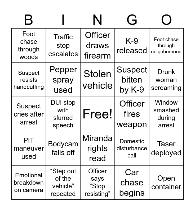 This bingo card has a free space and 25 words: PIT maneuver used, “Step out of the vehicle” repeated, Officer says “Stop resisting”, Car chase begins, Foot chase through neighborhood, Foot chase through woods, Traffic stop escalates, Officer draws firearm, Officer fires weapon, Taser deployed, Suspect resists handcuffing, Pepper spray used, Suspect pulls a knife, Domestic disturbance call, Drunk woman screaming, Emotional breakdown on camera, DUI stop with slurred speech, Stolen vehicle, Suspect bitten by K-9, Window smashed during arrest, Suspect cries after arrest, Bodycam falls off, Miranda rights read, K-9 released and Open container.