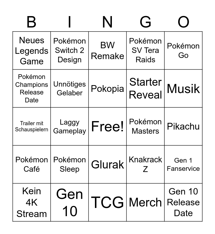 This bingo card has a free space and 24 words: Pokémon Sleep, Gen 10, Pokopia, Kein 4K Stream, Pokémon Go, Neues Legends Game, Pokémon Champions Release Date, Pokémon Switch 2 Design, Pokémon Masters, Glurak, Starter Reveal, Trailer mit Schauspielern, Knakrack Z, Gen 1 Fanservice, Unnötiges Gelaber, Merch, Pikachu, BW Remake, Musik, Laggy Gameplay, Gen 10 Release Date, Pokémon Café, Pokémon SV Tera Raids and TCG.