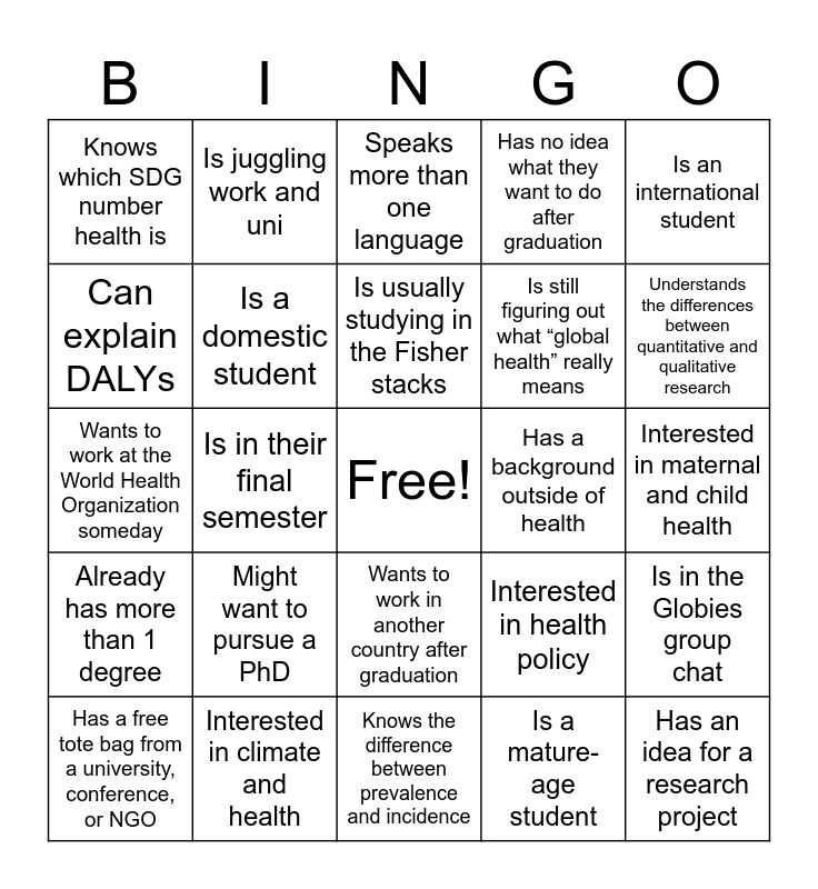 This bingo card has a free space and 32 words: Is a mature-age student, Is in their first semester, Is in their final semester, Came straight from undergrad, Already has more than 1 degree, Is a domestic student, Is an international student, Is in the Globies group chat, Is juggling work and uni, Can usually be found at Edward Ford, Is usually studying in the Fisher stacks, Speaks more than one language, Has lived in more than 2 countries, Has a clinical background, Has a background outside of health, Has worked in the health space before, Has a free tote bag from a university, conference, or NGO, Wants to work at the World Health Organization someday, Wants to work in another country after graduation, Might want to pursue a PhD, Interested in health policy, Interested in epidemiology, Interested in maternal and child health, Interested in climate and health, Has an idea for a research project, Has no idea what they want to do after graduation, Is still figuring out what “global health” really means, Can explain DALYs, Knows which SDG number health is, Knows the difference between prevalence and incidence, Knows what One Health is and Understands the differences between quantitative and qualitative research.