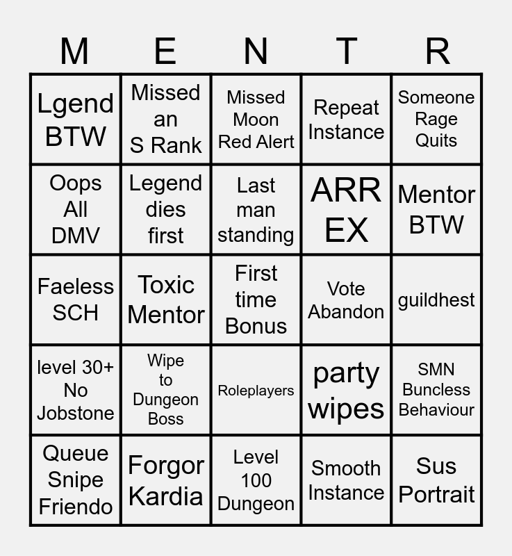 This bingo card has a free space and 39 words: Why you run with stack marker?, Runs away with stack marker, MSQ Roulette, Legend dies first, Queue Snipe Friendo, Roleplayers, Last man standing, Vote dismiss passes, Someone Rage Quits, level 30+ No Jobstone, Toxic Mentor, Repeat Instance, Sus Portrait, guildhest, Vote Abandon, Wipe to Dungeon Boss, 4+ mentors, Lgend BTW, Duty In Progress, party wipes, Oops All DMV, Level 100 Dungeon, ARR EX, Mentor BTW, Domo Arigato MR ROBOT, Oops All Bnuuy, Rescue Memes, Clutch Victory, Clutch Failure, Missed an S Rank, M5N-M8N, Jeuno, Missed Moon Red Alert, Forgor Kardia, Smooth Instance, Green DPS go brrr, SMN Buncless Behaviour, Faeless SCH and Forgor Dance Partner.