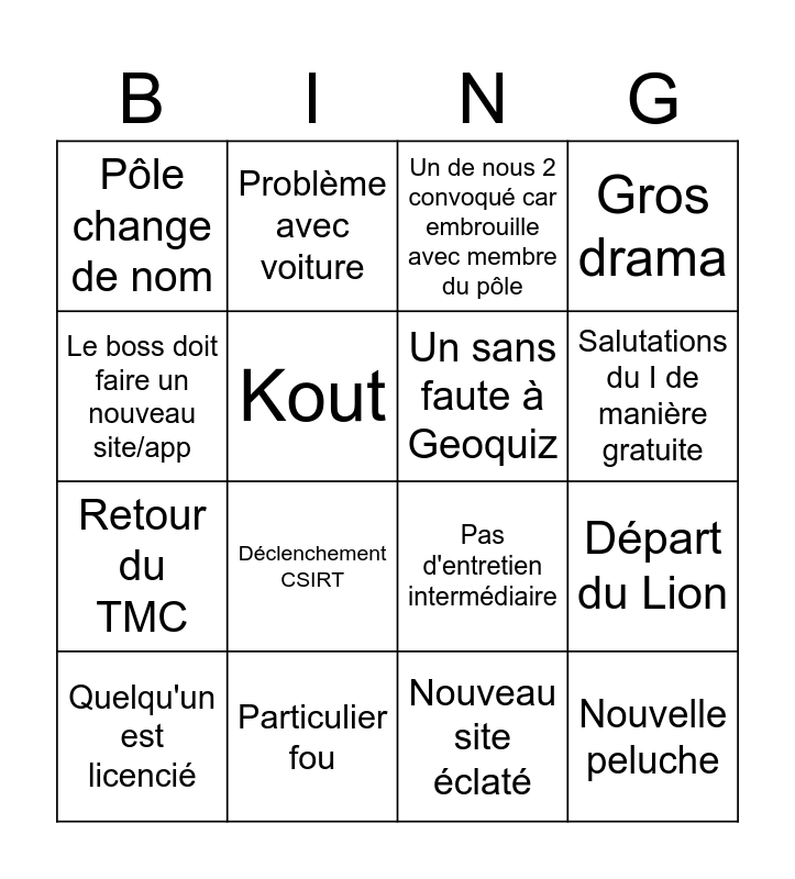 This bingo card has 16 words: Particulier fou, Départ du Lion, Un de nous 2 convoqué car embrouille avec membre du pôle, Pôle change de nom, Retour du TMC, Problème avec voiture, Pas d'entretien intermédiaire, Nouveau site éclaté, Le boss doit faire un nouveau site/app, Kout, Quelqu'un est licencié, Gros drama, Déclenchement CSIRT, Salutations du I de manière gratuite, Un sans faute à Geoquiz and Nouvelle peluche.