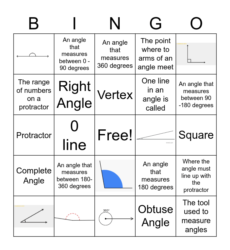 This bingo card has 10 images, a free space and 24 words: Acute Angle, Obtuse Angle, Reflex Angle, Straight Angle, Complete Angle, Right Angle, An angle that measures between 0 - 90 degrees, Vertex, An angle that measures 360 degrees, An angle that measures between 90 -180 degrees, Protractor, An angle that measures between 180-360 degrees, An angle that measures 180 degrees, An angle that measures 90 degrees, Square, The tool used to measure angles, The point where to arms of an angle meet, Arm, One line in an angle is called, The range of numbers on a protractor, Scale, 0 line, Where the angle must line up with the protractor and Reflex Angle.