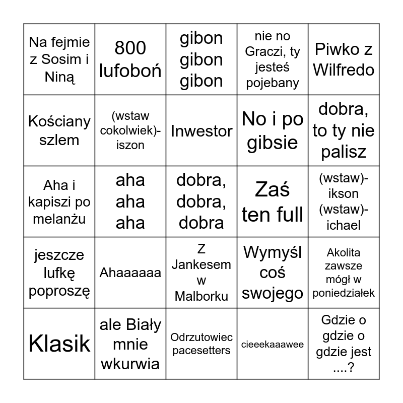 This bingo card has 25 words: Ahaaaaaa, Odrzutowiec pacesetters, Inwestor, Klasik, Piwko z Wilfredo, Na fejmie z Sosim i Niną, Kościany szlem, 800 lufoboń, Zaś ten full, Z Jankesem w Malborku, No i po gibsie, Aha i kapiszi po melanżu, Wymyśl coś swojego, Akolita zawsze mógł w poniedziałek, (wstaw cokolwiek)-iszon, Gdzie o gdzie o gdzie jest ....?, (wstaw)-ikson (wstaw)-ichael, gibon gibon gibon, dobra, to ty nie palisz, aha aha aha, dobra, dobra, dobra, ale Biały mnie wkurwia, jeszcze lufkę poproszę, nie no Graczi, ty jesteś pojebany and cieeekaaawee.