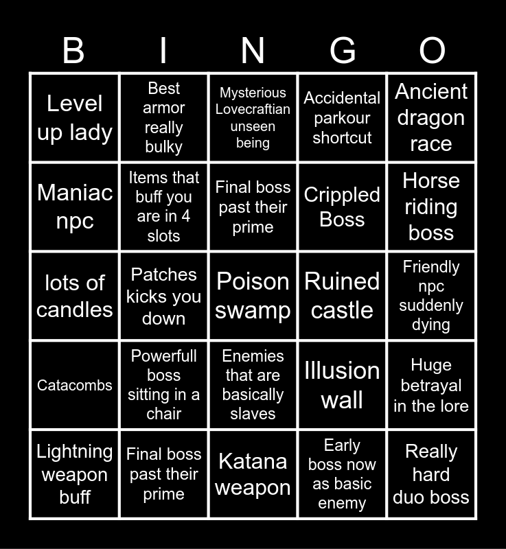 This bingo card has a free space and 24 words: Powerfull boss sitting in a chair, Final boss past their prime, Final boss past their prime, Lightning weapon buff, Ancient dragon race, Level up lady, Maniac npc, Best armor really bulky, Ruined castle, Enemies that are basically slaves, Crippled Boss, lots of candles, Illusion wall, Huge betrayal in the lore, Items that buff you are in 4 slots, Early boss now as basic enemy, Friendly npc suddenly dying, Mysterious Lovecraftian unseen being, Horse riding boss, Patches kicks you down, Really hard duo boss, Catacombs, Accidental parkour shortcut and Katana weapon.