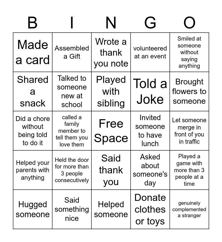 This bingo card has a free space and 24 words: Held the door for more than 3 people consecutively, Said something nice, Played with sibling, Hugged someone, Smiled at someone without saying anything, Made a card, Shared a snack, Assembled a Gift, Invited someone to have lunch, Said thank you, Told a Joke, Did a chore without being told to do it, Asked about someone's day, Played a game with more than 3 people at a time, Talked to someone new at school, Donate clothes or toys, Let someone merge in front of you in traffic, Wrote a thank you note, Brought flowers to someone, called a family member to tell them you love them, genuinely complemented a stranger, Helped your parents with anything, volunteered at an event and Helped someone.