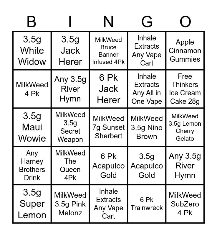 This bingo card has 61 words: Free!, MilkWeed 3.5g Pink Melonz, 3.5g Trainwreck, Any Harney Brothers Drink, 6 Pk Trainwreck, MilkWeed 3.5g Pina Colada, Any 3.5g River Hymn, MilkWeed 3.5g Permanent Chimera, Inhale Extracts Any All in One Vape, Hibiscus Lemonade Gummies, Inhale Extracts Any Vape Cart, Sleep Gummies, MilkWeed 4 Pk, High and Mighty Any Vape Cart, Any Free Thinkers Pre Roll, 3.5g White Widow, MilkWeed 7g Sunset Sherbert, Apple Cinnamon Gummies, 6 Pk Maui Wowie, 6 Pk Jack Herer, MilkWeed 3.5g Nino Brown, MilkWeed Bruce Banner Infused 4Pk, 3.5g Super Lemon, Any 3.5g River Hymn, 6 Pk Gorilla Glue, Any Zoom Zoom Doobies, Free Thinkers Apple Fritters 28g, Dirty Bird Gorilla Glue, Free Thinkers Ice Cream Cake 28g, Sweet Salted Dark Chocolate Bar, Any 3.5g River Hymn, Dirty Bird Northern Lights, MilkWeed Nino Brown 4 Pk, Summer Highberry Gummies, 3.5g Jack Herer, MilkWeed 3.5g Catskill Candy, 3.5g Gorilla Glue, MilkWeed 3.5g Secret Weapon, 6 Pk White Widow, 3.5g Maui Wowie, Any OHHO CBD Product, MilkWeed The Queen 4Pk, MilkWeed 3.5g Lemon Cherry Gelato, MilkWeed 3.5g Bluetopia, 3.5g Acapulco Gold, MilkWeed Infused LCG 4Pk, MilkWeed 7g Lemon Cherry Gelato, Inhale Extracts Any All in One Vape, Strawberry Habanero Gummies, 6 Pk Acapulco Gold, Inhale Extracts Any Vape Cart, Any OHHO CBD Product, 3.5 g Northern Lights, Dirty Bird Super Lemon, 6 Pk Super Lemon, MilkWeed 3.5g Sour Sherbanger, MilkWeed Blutopia 4 Pk, 6 Pk Northern Lights, Any Zoom Zoom Doobies, MilkWeed SubZero 4 Pk and MilkWeed 3.5g Sunset Sherbert.