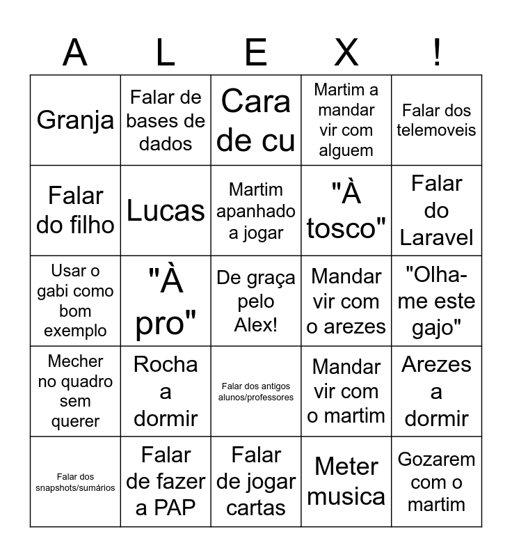 This bingo card has a free space and 38 words: "Dá-me gozo", "À unha", Pedro Martins, Lucas, Arezes a dormir, Rocha a dormir, Martim apanhado a jogar, Guilherme Oliveira, Falar dos telemoveis, "À tosco", "À pro", Martim a mandar vir com alguem, Gozarem com o martim, "Olha-me este gajo", Falar do filho, Mecher no quadro sem querer, Pose Kawai, Cara de cu, "Nem vejo o pessoa", Mandar vir com o arezes, Granja, Falar de fazer a PAP, Falar do Laravel, Falar dos snapshots/sumários, Vir alguem do 1º turno/funcionária, Falar de jogar cartas, Falar de jogos, Rondar a sala, Empinar o cu, Bazar da sala no meio da aula, Falar sozinho, Falar dos antigos alunos/professores, Meter musica, Falar de bases de dados, Mandar vir com o rocha, Mandar vir com o martim, Usar o gabi como bom exemplo and Pintarolas.