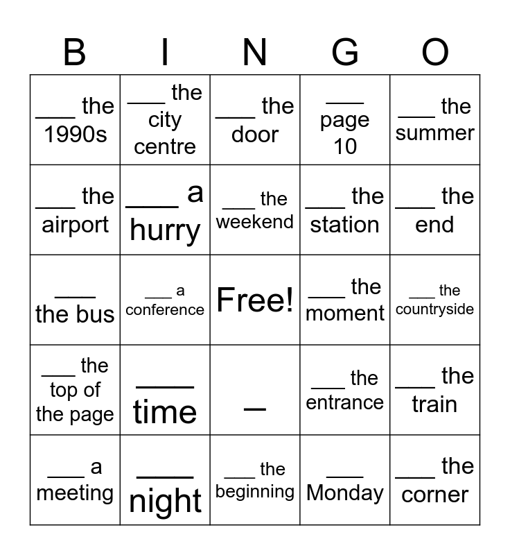 This bingo card has a free space and 26 words: _, ___ Monday, ___ the weekend, ___ night, ___ the summer, ___ the 1990s, ___ the airport, ___ the city centre, ___ the countryside, ___ the entrance, ___ the station, ___ the bus, ___ the train, ___ a meeting, ___ a conference, ___ a party, ___ page 10, ___ the top of the page, ___ the door, ___ the corner, ___ the end, ___ the beginning, ___ the moment, ___ time, ___ a hurry and ___ the office.