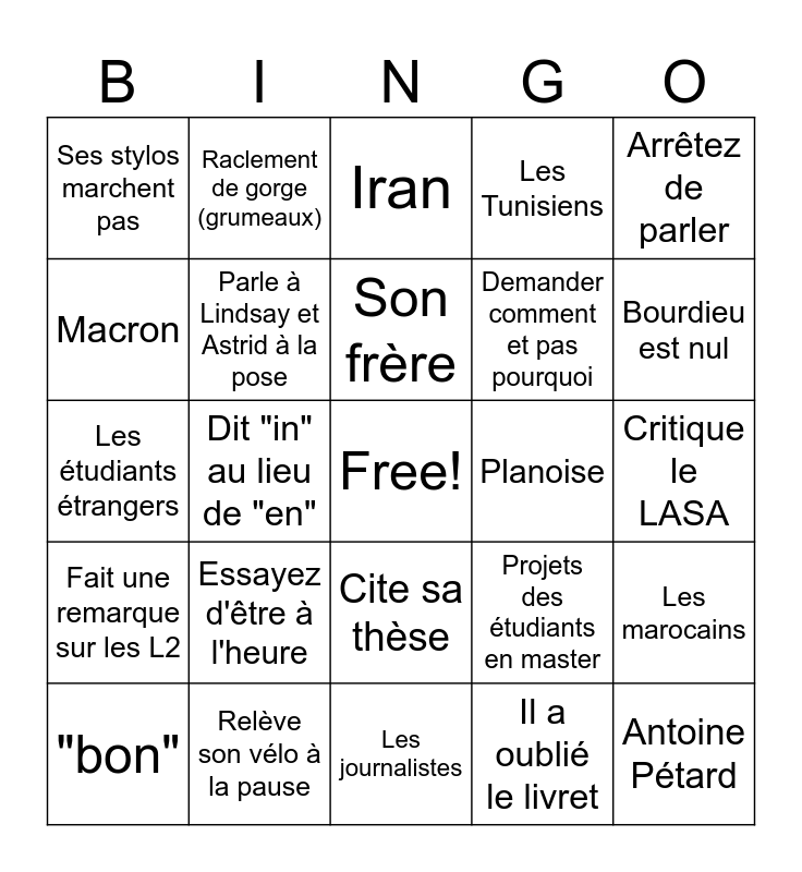This bingo card has a free space and 24 words: "bon", Essayez d'être à l'heure, Son frère, Il a oublié le livret, Arrêtez de parler, Ses stylos marchent pas, Raclement de gorge (grumeaux), Iran, Planoise, Critique le LASA, Les étudiants étrangers, Parle à Lindsay et Astrid à la pose, Projets des étudiants en master, Les marocains, Macron, Relève son vélo à la pause, Les journalistes, Les Tunisiens, Bourdieu est nul, Fait une remarque sur les L2, Dit "in" au lieu de "en", Cite sa thèse, Demander comment et pas pourquoi and Antoine Pétard.