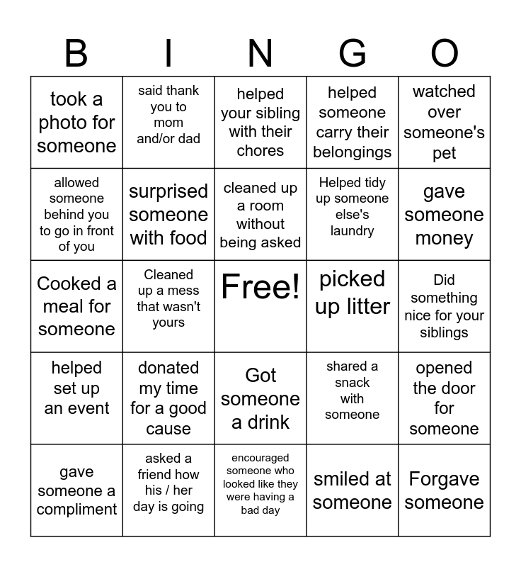 This bingo card has a free space and 24 words: gave someone a compliment, donated my time for a good cause, cleaned up a room without being asked, smiled at someone, watched over someone's pet, took a photo for someone, said thank you to mom and/or dad, helped your sibling with their chores, picked up litter, Did something nice for your siblings, Cooked a meal for someone, surprised someone with food, shared a snack with someone, opened the door for someone, allowed someone behind you to go in front of you, asked a friend how his / her day is going, encouraged someone who looked like they were having a bad day, helped someone carry their belongings, gave someone money, helped set up an event, Cleaned up a mess that wasn't yours, Got someone a drink, Helped tidy up someone else's laundry and Forgave someone.