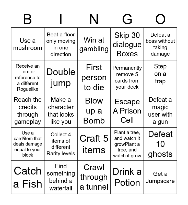This bingo card has 65 words: Free!, Tame an enemy, Get an extra movement option ( dash, jump, etc.), Defeat 10 ghosts, Equip 3 Diffrent hats, Get 2 legendary items, Beat a floor only moving in one direction, Destroy 20 Crates, barrels, or urns, First person to die, Get 3 enemies to defeat an ally, Craft 5 items, Reroll reward options 5 times, Defeat a magic user with a gun, Defeat a boss without taking damage, Have 3 pets, Receive an item or reference to a different Roguelike, Make a character that looks like you, Use a mushroom, Win a fight without dealing damage, Permanently remove 5 cards from your deck, Collect 4 items of different Rarity levels, Use a card/item that deals damage equal to your block, Skip 30 dialogue Boxes, Find 3 secret rooms, Land 10 critical hits, Ride a boat, Get a trophy, Solve a Puzzle, Blow up a Bomb, Fly a Spaceship, Catch a Fish, Use a Shield, Stand on a rooftop, Clear a dungeon, Plant a tree, and watch it growPlant a tree, and watch it grow, Find something behind a waterfall, Emote, Reach the credits through gameplay, Drink a Potion, Open a Treasure chest, Double jump, Get cursed, Escape A Prison Cell, Build a bridge, Get a kill streak, Read a book, Step on a trap, Use fast travel, Get a Jumpscare, Automate something indefinitely, Go through a Portal, Kill a Dragon, Use a Jetpack, Crawl through a tunnel, Have a machine craft something for you, Get full armour, Cross the entire map, Win at gambling, Parry an attack, Find a Dinosaur, go to another dimension, hit the world border, get an extra life, break glass and climb a ladder.