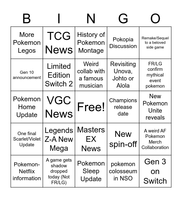 This bingo card has a free space and 24 words: Legends Z-A New Mega, A game gets shadow dropped today (Not FR/LG), Weird collab with a famous musician, Pokemon-Netflix information, Remake/Sequel to a beloved side game, More Pokemon Legos, Gen 10 announcement, TCG News, Champions release date, Masters EX News, Revisiting Unova, Johto or Alola, Pokemon Home Update, New spin-off, A weird AF Pokemon Merch Collaboration, Limited Edition Switch 2, pokemon colosseum in NSO, New Pokemon Unite reveals, History of Pokemon Montage, FR/LG confirm mythical event pokemon, VGC News, Gen 3 on Switch, One final Scarlet/Violet Update, Pokopia Discussion and Pokemon Sleep Update.
