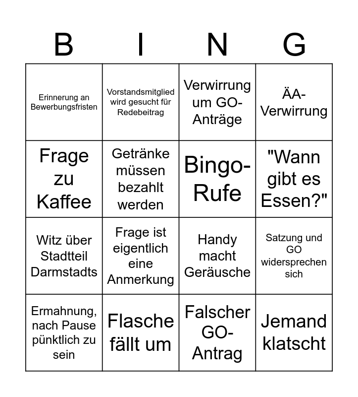 This bingo card has 16 words: Flasche fällt um, Satzung und GO widersprechen sich, Verwirrung um GO-Anträge, Erinnerung an Bewerbungsfristen, Witz über Stadtteil Darmstadts, Vorstandsmitglied wird gesucht für Redebeitrag, Handy macht Geräusche, Falscher GO-Antrag, Frage zu Kaffee, Getränke müssen bezahlt werden, Ermahnung, nach Pause pünktlich zu sein, ÄA-Verwirrung, Frage ist eigentlich eine Anmerkung, "Wann gibt es Essen?", Bingo-Rufe and Jemand klatscht.