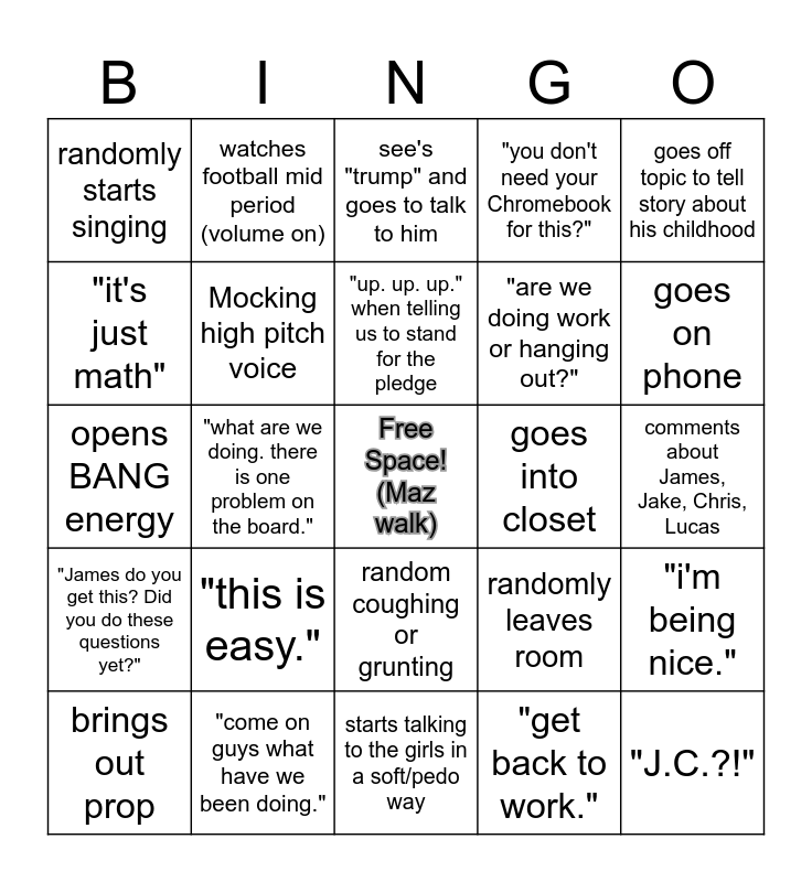 This bingo card has a free space and 24 words: "this is easy.", "come on guys what have we been doing.", "up. up. up." when telling us to stand for the pledge, brings out prop, goes off topic to tell story about his childhood, randomly starts singing, "it's just math", watches football mid period (volume on), goes into closet, random coughing or grunting, "are we doing work or hanging out?", opens BANG energy, randomly leaves room, "i'm being nice.", Mocking high pitch voice, "get back to work.", comments about James, Jake, Chris, Lucas, see's "trump" and goes to talk to him, goes on phone, "what are we doing. there is one problem on the board.", "J.C.?!", "James do you get this? Did you do these questions yet?", "you don't need your Chromebook for this?" and starts talking to the girls in a soft/pedo way.
