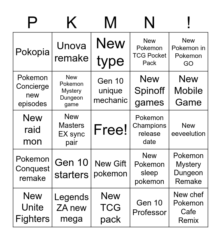 This bingo card has a free space and 24 words: Gen 10 starters, Legends ZA new mega, Gen 10 unique mechanic, New Unite Fighters, New Pokemon in Pokemon GO, Pokopia, Pokemon Concierge new episodes, Unova remake, Pokemon Champions release date, New Gift pokemon, New Spinoff games, New raid mon, New Pokemon sleep pokemon, Pokemon Mystery Dungeon Remake, New Pokemon Mystery Dungeon game, Gen 10 Professor, New eeveelution, New type, New Mobile Game, New Masters EX sync pair, New chef Pokemon Cafe Remix, Pokemon Conquest remake, New Pokemon TCG Pocket Pack and New TCG pack.
