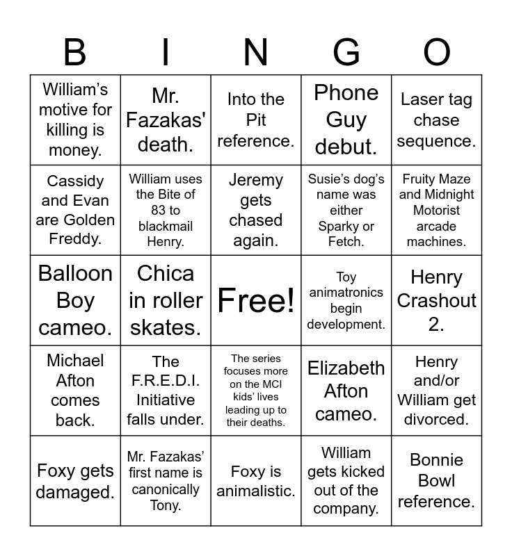 This bingo card has a free space and 24 words: The F.R.E.D.I. Initiative falls under., Mr. Fazakas’ first name is canonically Tony., Jeremy gets chased again., Foxy gets damaged., Laser tag chase sequence., William’s motive for killing is money., Cassidy and Evan are Golden Freddy., Mr. Fazakas' death., Toy animatronics begin development., The series focuses more on the MCI kids’ lives leading up to their deaths., Susie’s dog’s name was either Sparky or Fetch., Balloon Boy cameo., Elizabeth Afton cameo., Henry and/or William get divorced., William uses the Bite of 83 to blackmail Henry., William gets kicked out of the company., Henry Crashout 2., Into the Pit reference., Fruity Maze and Midnight Motorist arcade machines., Chica in roller skates., Bonnie Bowl reference., Michael Afton comes back., Phone Guy debut. and Foxy is animalistic..