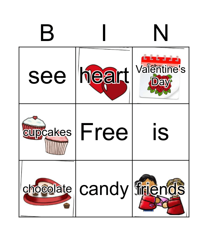 This bingo card has 5 images, a free space and 9 words: chocolate, Valentine's Day, heart, cupcakes, see, is, friends, like and candy.