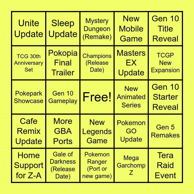 This bingo card has a free space and 24 words: More GBA Ports, Gale of Darkness (Release Date), Champions (Release Date), Home Support for Z-A, Gen 10 Title Reveal, Unite Update, TCG 30th Anniversary Set, Sleep Update, New Animated Series, New Legends Game, Masters EX Update, Pokepark Showcase, Pokemon GO Update, Gen 5 Remakes, Pokopia Final Trailer, Mega Garchomp Z, Gen 10 Starter Reveal, Mystery Dungeon (Remake), TCGP New Expansion, Gen 10 Gameplay, Tera Raid Event, Cafe Remix Update, New Mobile Game and Pokemon Ranger (Port or new game).