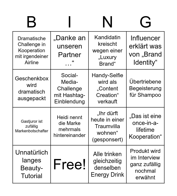 This bingo card has 21 words: Free!, Kandidatin schwärmt auffällig von einem Produkt, „Danke an unseren Partner …“, Nahaufnahme vom Logo in Zeitlupe, Alle trinken gleichzeitig denselben Energy Drink, Handy-Selfie wird als „Content Creation“ verkauft, Dramatische Challenge in Kooperation mit irgendeiner Airline, Kandidatin kreischt wegen einer „Luxury Brand“, „Ihr dürft heute in einer Traumvilla wohnen“ (gesponsert), Übertriebene Begeisterung für Shampoo, Gastjuror ist zufällig Markenbotschafter, Influencer erklärt was von „Brand Identity“, Produkt wird im Interview ganz zufällig nochmal erwähnt, „Ihr dürft euch heute ein Outfit aussuchen“ (alles exakt eine Marke), Social-Media-Challenge mit Hashtag-Einblendung, Kandidatin sagt: „Ich fühle mich so empowered mit diesem Look“, Unnatürlich langes Beauty-Tutorial, Heidi nennt die Marke mehrmals hintereinander, Geschenkbox wird dramatisch ausgepackt, „Das ist eine once-in-a-lifetime Kooperation“ and Luxuriöse Autofahrt zum Set – mit extra Kamerafokus aufs Logo.
