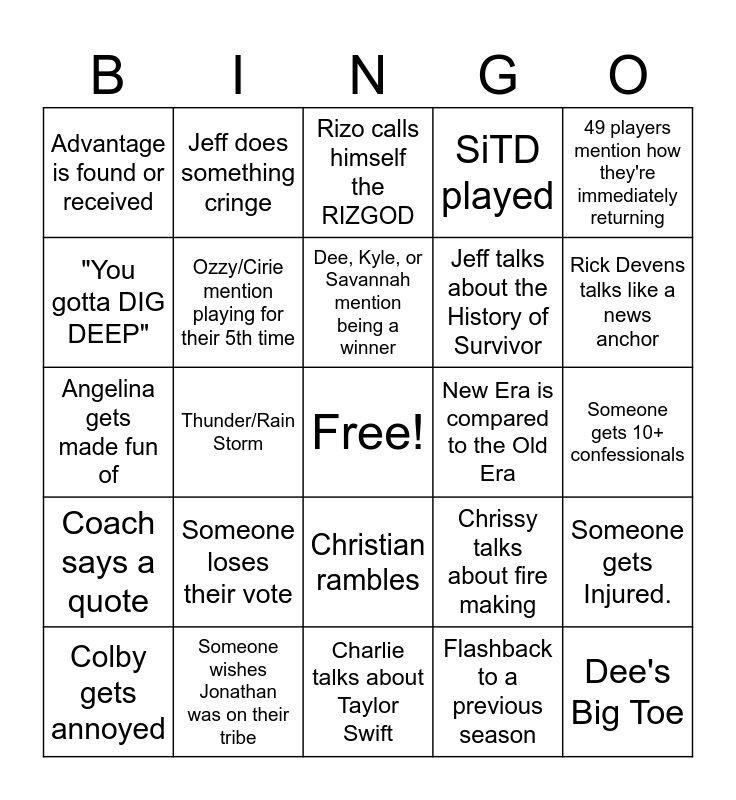 This bingo card has a free space and 34 words: Jenna mentions playing on Season 1, Flashback to a previous season, Players mention targeting Q, Mike mentions White Lotus, Coach says a quote, Ozzy/Cirie mention playing for their 5th time, 49 players mention how they're immediately returning, Colby gets annoyed, Jeff does something cringe, Celebrity BS, Dee, Kyle, or Savannah mention being a winner, Rizo calls himself the RIZGOD, Fan vote is highlighted, More than one player goes home, New Era is compared to the Old Era, Rick Devens talks like a news anchor, Someone wishes Jonathan was on their tribe, Angelina gets made fun of, Someone loses their vote, Chrissy talks about fire making, Christian rambles, Players get muddy, Advantage is found or received, Someone gets 10+ confessionals, Charlie talks about Taylor Swift, Dee's Big Toe, SiTD played, Super cool intro, Jeff talks about the History of Survivor, "You gotta DIG DEEP", "That's how you do it on Survivor"(50), Thunder/Rain Storm, Someone gets Injured. and "I can't believe I'm playing again!".