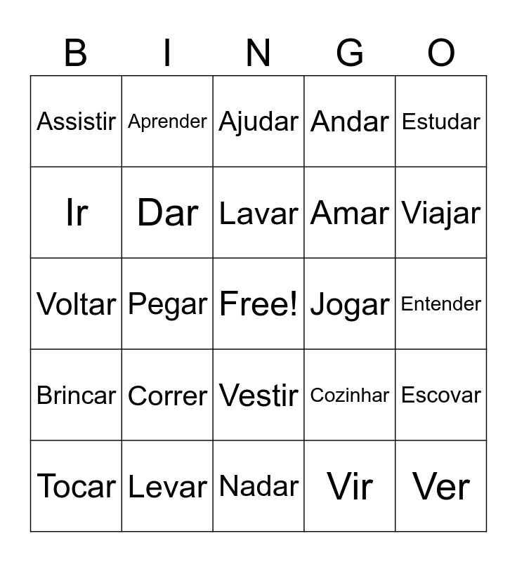 This bingo card has a free space and 24 words: Correr, Levar, Lavar, Tocar, Estudar, Assistir, Ir, Aprender, Jogar, Vestir, Amar, Voltar, Cozinhar, Escovar, Dar, Vir, Entender, Ajudar, Viajar, Pegar, Ver, Brincar, Andar and Nadar.