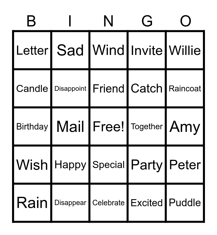 This bingo card has a free space and 24 words: Rain, Happy, Friend, Excited, Willie, Letter, Sad, Wind, Together, Amy, Birthday, Disappoint, Party, Peter, Candle, Disappear, Celebrate, Invite, Raincoat, Wish, Mail, Special, Catch and Puddle.